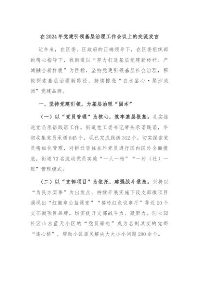 / 【七哥公文】2024年:在2024年党建引领基层治理工作会议上的交流发言+更多免费公文+VX:QiGeGongWen2024