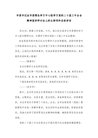 【七哥公文】2024年:市委书记在市委理论学习中心组学习党的二十届三中全会精神宣讲研讨会上的主持词和总结讲话+更多免费公文+VX:QiGeGongWen2024