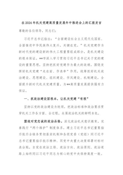 【七哥公文】2024年:在2024年机关党建高质量发展年中推进会上的汇报发言+更多免费公文+VX:QiGeGongWen2024