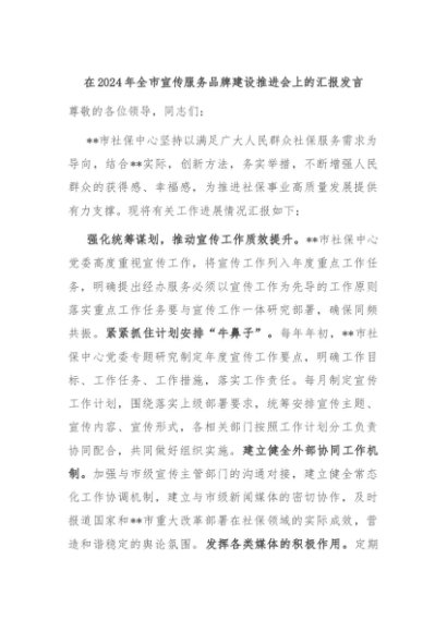 【七哥公文】2024年:在2024年全市宣传服务品牌建设推进会上的汇报发言+更多免费公文+VX:QiGeGongWen2024