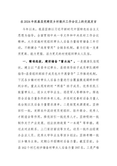 【七哥公文】2024年:在2024年抓基层党建促乡村振兴工作会议上的交流发言+更多免费公文+VX:QiGeGongWen2024