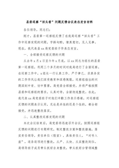 / 【七哥公文】2024年:县委巡察“回头看”问题反馈会议表态发言材料+更多免费公文+VX:QiGeGongWen2024