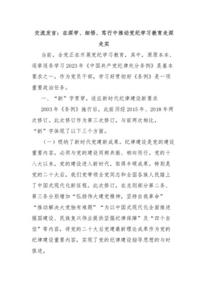 【七哥公文】2024年:交流发言:在深学、细悟、笃行中推动党纪学习教育走深走实+更多免费公文+VX:QiGeGongWen2024