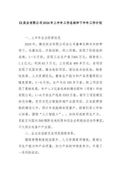 【七哥公文】2024年:XX实业有限公司2024年上半年工作总结和下半年工作计划+更多免费公文+VX:QiGeGongWen2024
