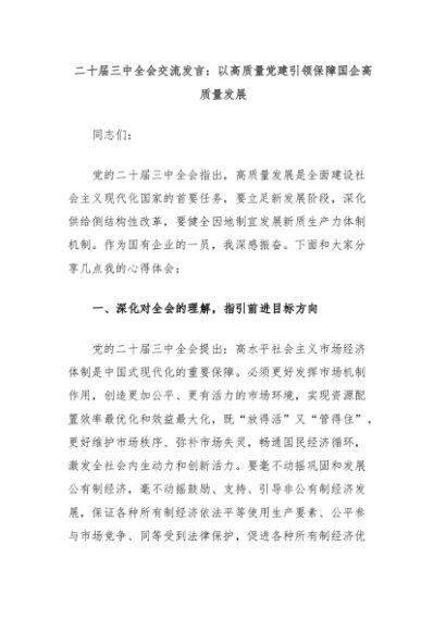 【七哥公文】2024年:二十届三中全会交流发言:以高质量党建引领保障国企高质量发展+更多免费公文+VX:QiGeGongWen2024