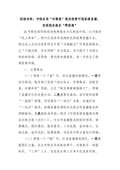 【七哥公文】2024年:经验材料:市税务局“四聚焦”做实税费可视答疑直播,实现税务服务“零距离”+更多免费公文+VX:QiGeGongWen2024