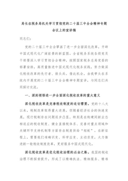 【七哥公文】2024年:局长在税务局机关学习贯彻党的二十届三中全会精神专题会议上的宣讲稿+更多免费公文+VX:QiGeGongWen2024