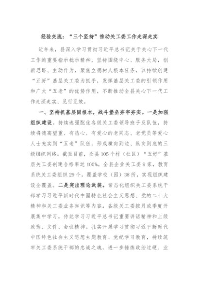 / 【七哥公文】2024年:经验交流:“三个坚持”推动关工委工作走深走实+更多免费公文+VX:QiGeGongWen2024