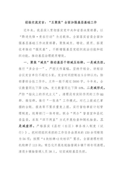 / 【七哥公文】2024年:经验交流发言:“五聚焦”全面加强基层基础工作+更多免费公文+VX:QiGeGongWen2024