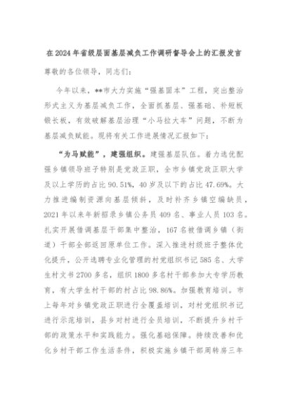 【七哥公文】2024年:在2024年省级层面基层减负工作调研督导会上的汇报发言+更多免费公文+VX:QiGeGongWen2024