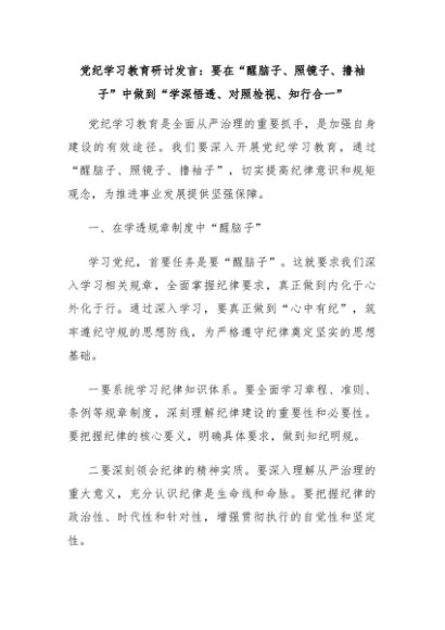 【七哥公文】2024年:党纪学习教育研讨发言:要在“醒脑子、照镜子、撸袖子”中做到“学深悟透、对照检视、知行合一”+更多免费公文+VX:QiGeGongWen2024