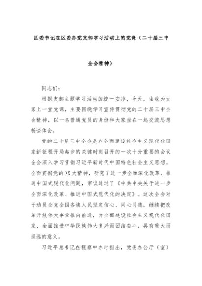 【七哥公文】2024年:区委书记在区委办党支部学习活动上的党课(二十届三中全会精神)+更多免费公文+VX:QiGeGongWen2024
