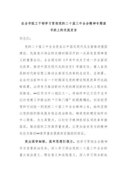 【七哥公文】2024年:在全市组工干部学习贯彻党的二十届三中全会精神专题读书班上的交流发言+更多免费公文+VX:QiGeGongWen2024
