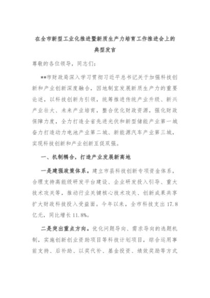 【七哥公文】2024年:在全市新型工业化推进暨新质生产力培育工作推进会上的典型发言+更多免费公文+VX:QiGeGongWen2024