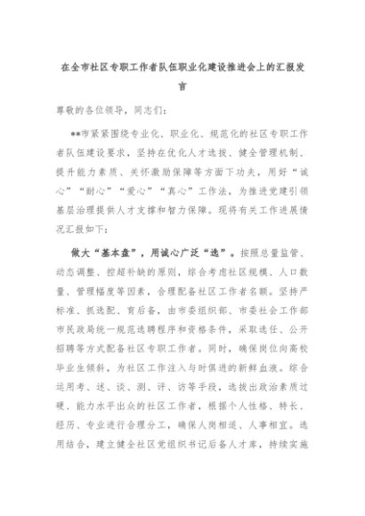 【七哥公文】2024年:在全市社区专职工作者队伍职业化建设推进会上的汇报发言+更多免费公文+VX:QiGeGongWen2024