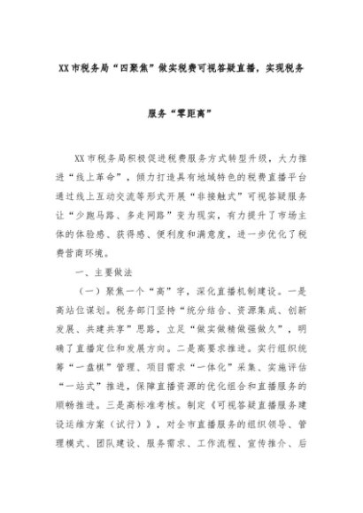 【七哥公文】2024年:XX市税务局“四聚焦”做实税费可视答疑直播,实现税务服务“零距离”+更多免费公文+VX:QiGeGongWen2024