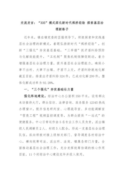 【七哥公文】2024年:交流发言:“335”模式深化新时代枫桥经验 探索基层治理新路子+更多免费公文+VX:QiGeGongWen2024