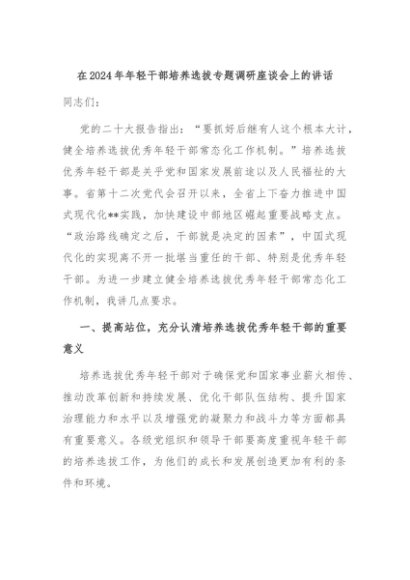 【七哥公文】2024年:在2024年年轻干部培养选拔专题调研座谈会上的讲话+更多免费公文+VX:QiGeGongWen2024
