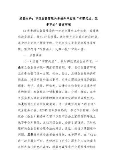 【七哥公文】2024年:经验材料:市场监督管理局多措并举打造“有需必应,无事不扰”营商环境+更多免费公文+VX:QiGeGongWen2024