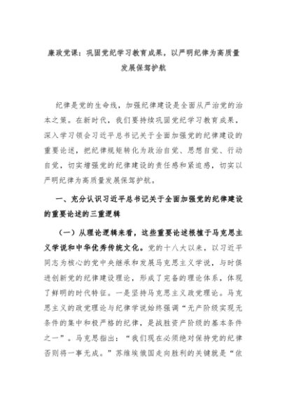 【七哥公文】2024年:廉政党课:巩固党纪学习教育成果,以严明纪律为高质量发展保驾护航+更多免费公文+VX:QiGeGongWen2024