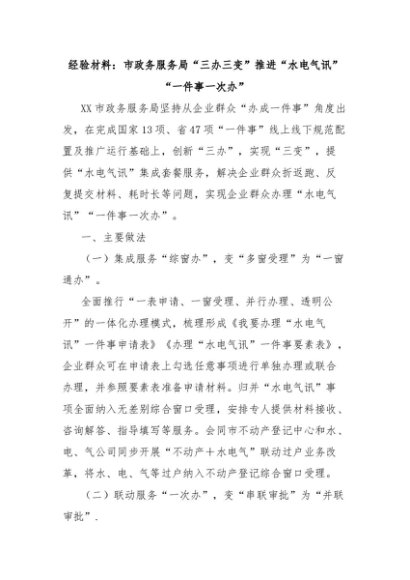 【七哥公文】2024年:经验材料:市政务服务局“三办三变”推进“水电气讯”“一件事一次办”+更多免费公文+VX:QiGeGongWen2024