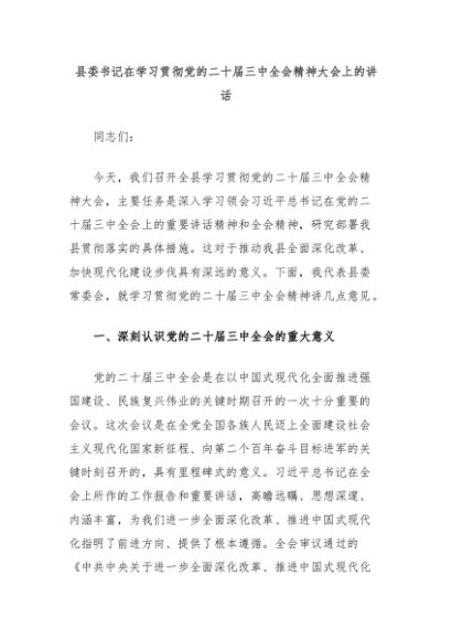 【七哥公文】2024年:县委书记在学习贯彻党的二十届三中全会精神大会上的讲话+更多免费公文+VX:QiGeGongWen2024