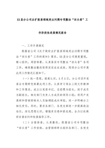 【七哥公文】2024年:XX县分公司业扩报装领域突出问题专项整治“回头看”工作阶段性进展情况报告+更多免费公文+VX:QiGeGongWen2024