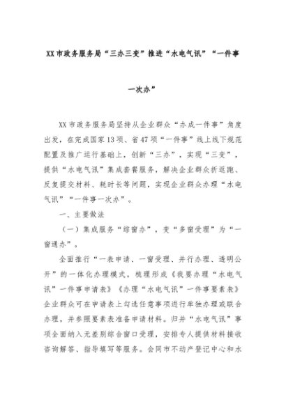 【七哥公文】2024年:XX市政务服务局“三办三变”推进“水电气讯”“一件事一次办”+更多免费公文+VX:QiGeGongWen2024