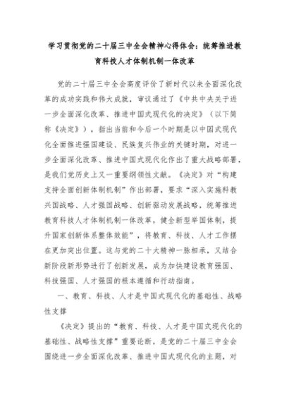 【七哥公文】2024年:学习贯彻党的二十届三中全会精神心得体会:统筹推进教育科技人才体制机制一体改革+更多免费公文+VX:QiGeGongWen2024