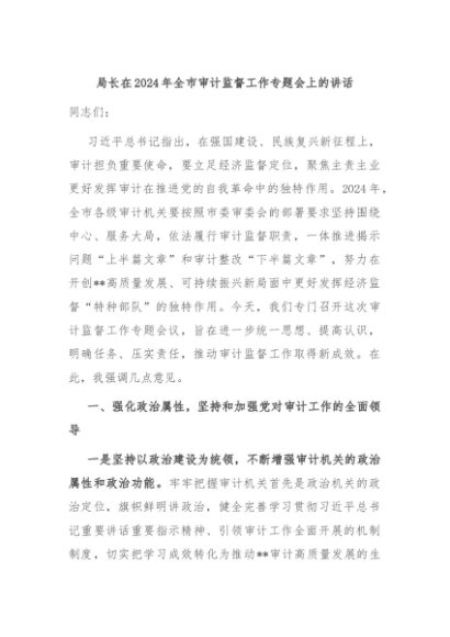 / 【七哥公文】2024年:局长在2024年全市审计监督工作专题会上的讲话+更多免费公文+VX:QiGeGongWen2024