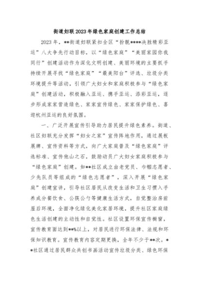 / 【七哥公文】2024年:街道妇联2023年绿色家庭创建工作总结+更多免费公文+VX:QiGeGongWen2024