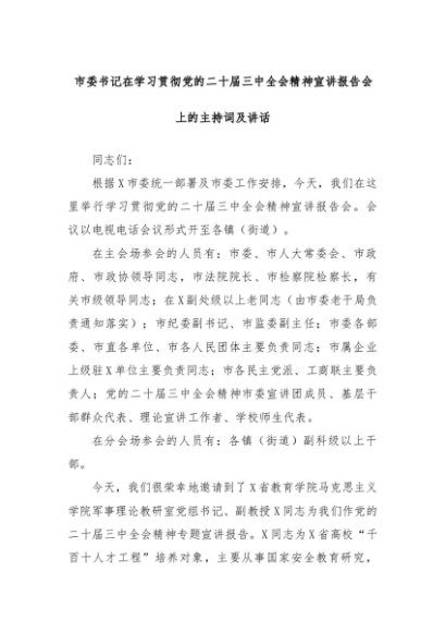 【七哥公文】2024年:市委书记在学习贯彻党的二十届三中全会精神宣讲报告会上的主持词及讲话+更多免费公文+VX:QiGeGongWen2024