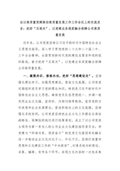 【七哥公文】2024年:在以高质量党建推动高质量发展工作工作会议上的交流发言:把好“五道关”,以党建业务深度融合保障公司高质量发展+更多免费公文+VX:QiGeGongWen2024