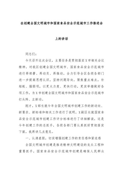 【七哥公文】2024年:在创建全国文明城市和国家食品安全示范城市工作推进会上的讲话+更多免费公文+VX:QiGeGongWen2024
