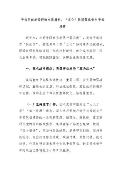 【七哥公文】2024年:干部队伍建设经验交流材料:“五化”协同强化青年干部培养+更多免费公文+VX:QiGeGongWen2024
