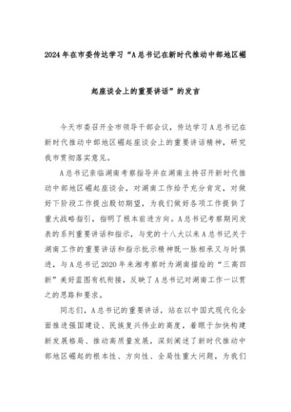 【七哥公文】2024年:2024年在市委传达学习“A总书记在新时代推动中部地区崛起座谈会上的重要讲话”的发言+更多免费公文+VX:QiGeGongWen2024