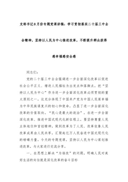 【七哥公文】2024年:支部书记8月份专题党课讲稿:学习贯彻落实二十届三中全会精神,坚持以人民为中心推进改革,不断提升群众获得感幸福感安全感+更多免费公文+VX:QiGeGongWen2024
