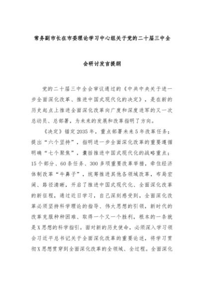 【七哥公文】2024年:常务副市长在市委理论学习中心组关于党的二十届三中全会研讨发言提纲+更多免费公文+VX:QiGeGongWen2024
