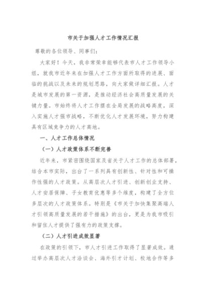 / 【七哥公文】2024年:市关于加强人才工作情况汇报+更多免费公文+VX:QiGeGongWen2024