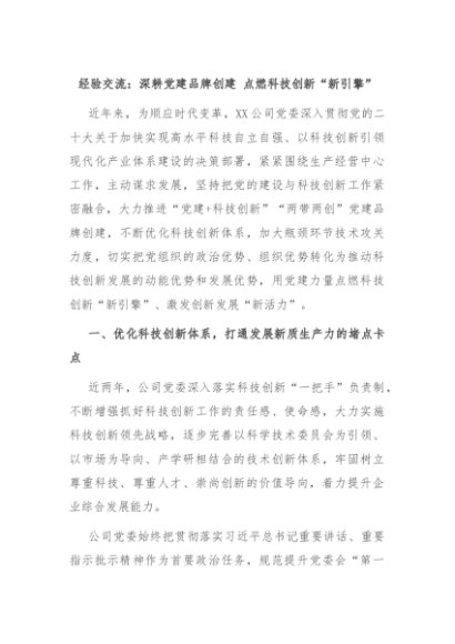 【七哥公文】2024年:经验交流:深耕党建品牌创建 点燃科技创新“新引擎”+更多免费公文+VX:QiGeGongWen2024