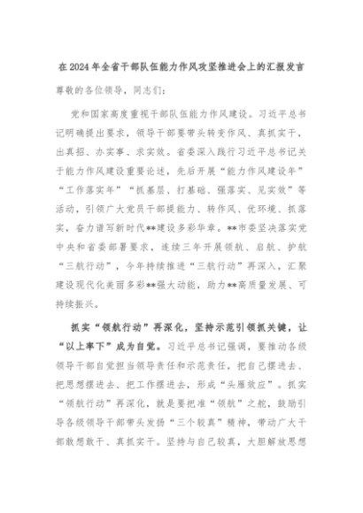 【七哥公文】2024年:在2024年全省干部队伍能力作风攻坚推进会上的汇报发言+更多免费公文+VX:QiGeGongWen2024