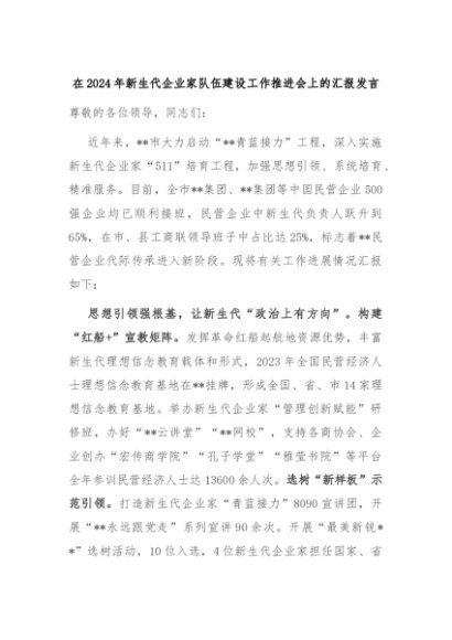 【七哥公文】2024年:在2024年新生代企业家队伍建设工作推进会上的汇报发言+更多免费公文+VX:QiGeGongWen2024