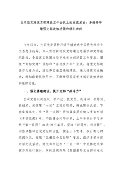 【七哥公文】2024年:在攻坚克难党支部建设工作会议上的交流发言:多措并举增强支部政治功能和组织功能+更多免费公文+VX:QiGeGongWen2024