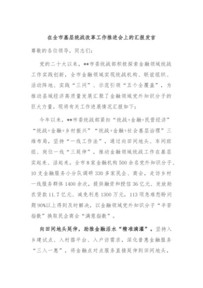 / 【七哥公文】2024年:在全市基层统战改革工作推进会上的汇报发言+更多免费公文+VX:QiGeGongWen2024