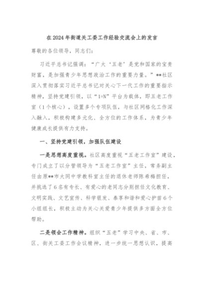 / 【七哥公文】2024年:在2024年街道关工委工作经验交流会上的发言+更多免费公文+VX:QiGeGongWen2024