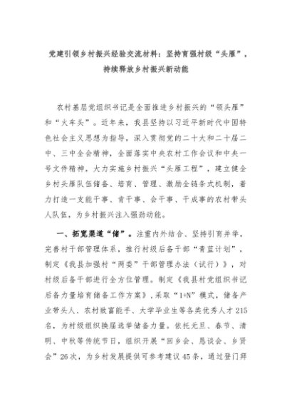 【七哥公文】2024年:党建引领乡村振兴经验交流材料:坚持育强村级“头雁”,持续释放乡村振兴新动能+更多免费公文+VX:QiGeGongWen2024