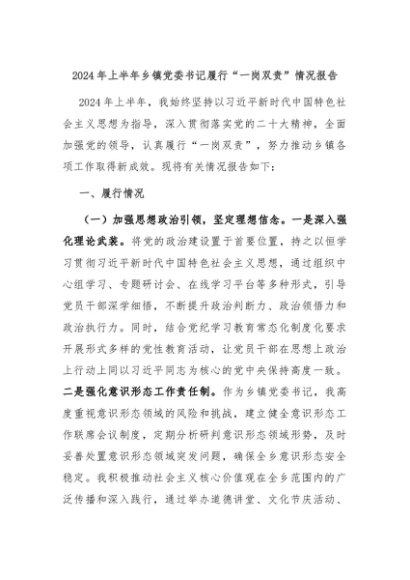 【七哥公文】2024年:2024年上半年乡镇党委书记履行“一岗双责”情况报告+更多免费公文+VX:QiGeGongWen2024