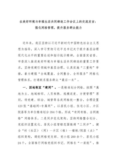 【七哥公文】2024年:在美好环境与幸福生活共同缔造工作会议上的交流发言:强化网格管理,提升服务群众能力+更多免费公文+VX:QiGeGongWen2024