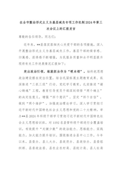 【七哥公文】2024年:在全市整治形式主义为基层减负专项工作机制2024年第三次会议上的汇报发言+更多免费公文+VX:QiGeGongWen2024