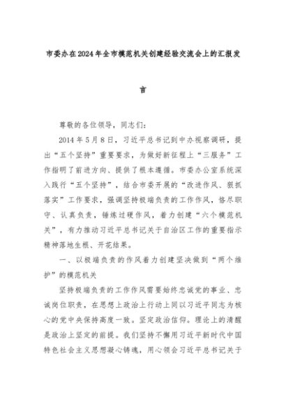 【七哥公文】2024年:市委办在2024年全市模范机关创建经验交流会上的汇报发言+更多免费公文+VX:QiGeGongWen2024
